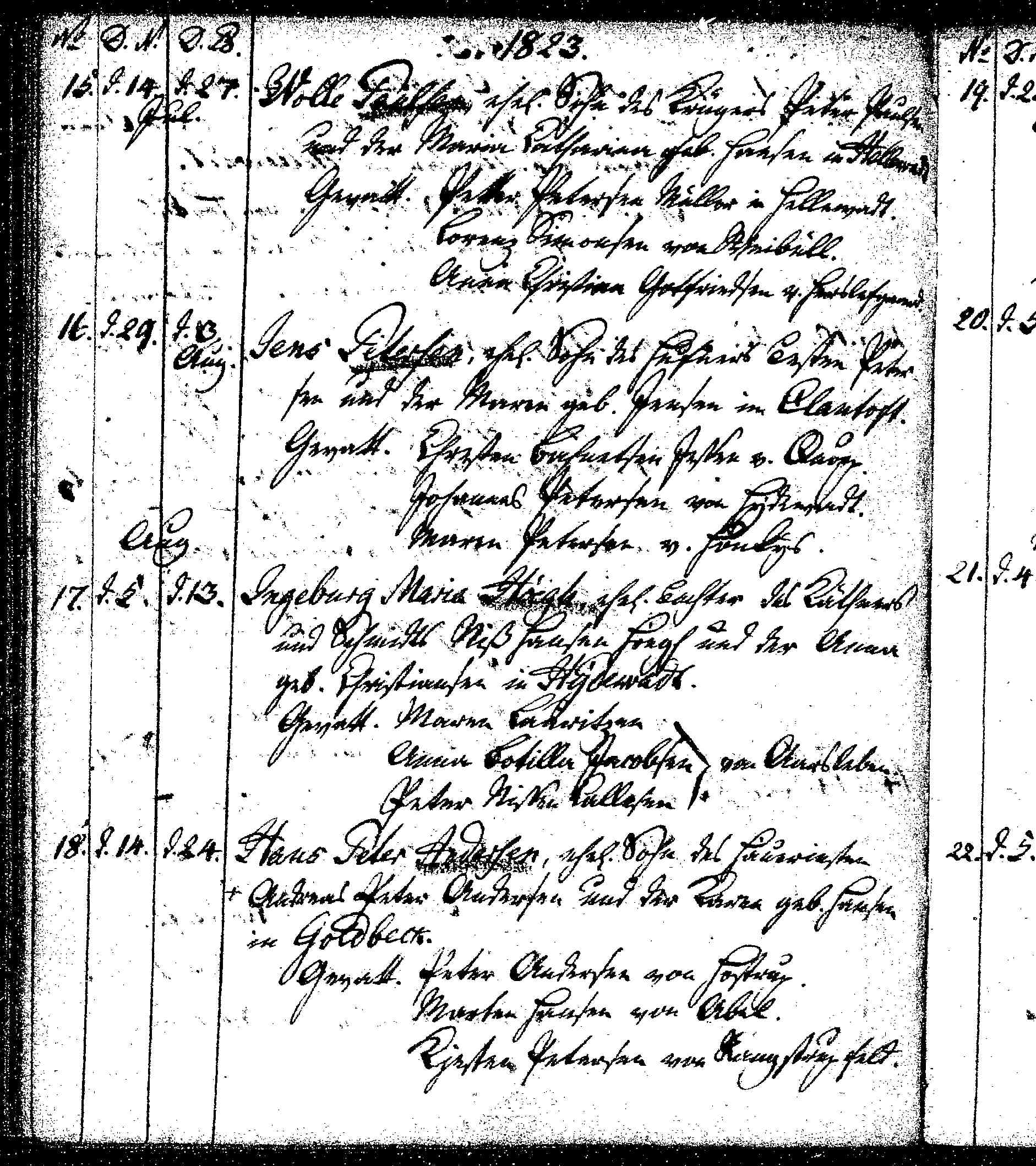 Kirkebog 1764-1840, Hellevad, Opslag 228, nr. 17: Dåb 13 august 1823, født den 5 august, Ingeborg Marie Hoegh, en ægte datter af Nis Hansen Hoegh og fru Anna f. Christensen, i Hellevad. Faddere: Maren Christensen ?, ? Botilla Jacobsen, ? i Aarsleben
