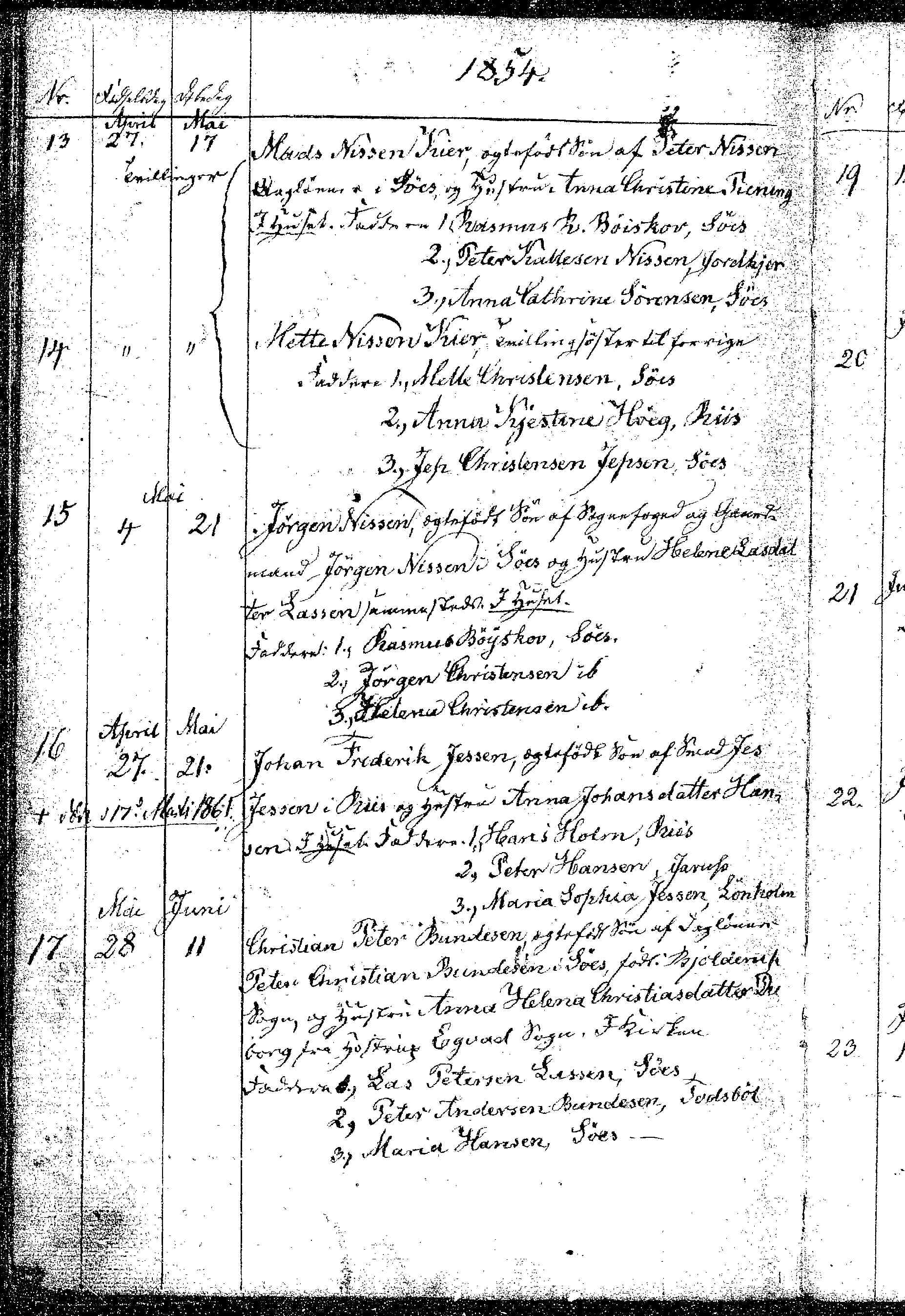 Rise KB 1825-1857, Rise Kirkebog 1854, Fødte nr. 17 Født Mai 28, døbt Juni 11 Christian Peter Bundesen, ægtefødt Sön af daglönner Peter Christian Bundesen i Söes, fød: Bjolderup Sogn, og hustru Anna Helena Christiansdatter Duborg fra Hostrup Egvad Sogn. I kirken Faddere: 1. Las Petersen Lassen, Söes. 2. Peter Andersen Bundesen, Todsböl, 3. Maria Hansen, Söes. --