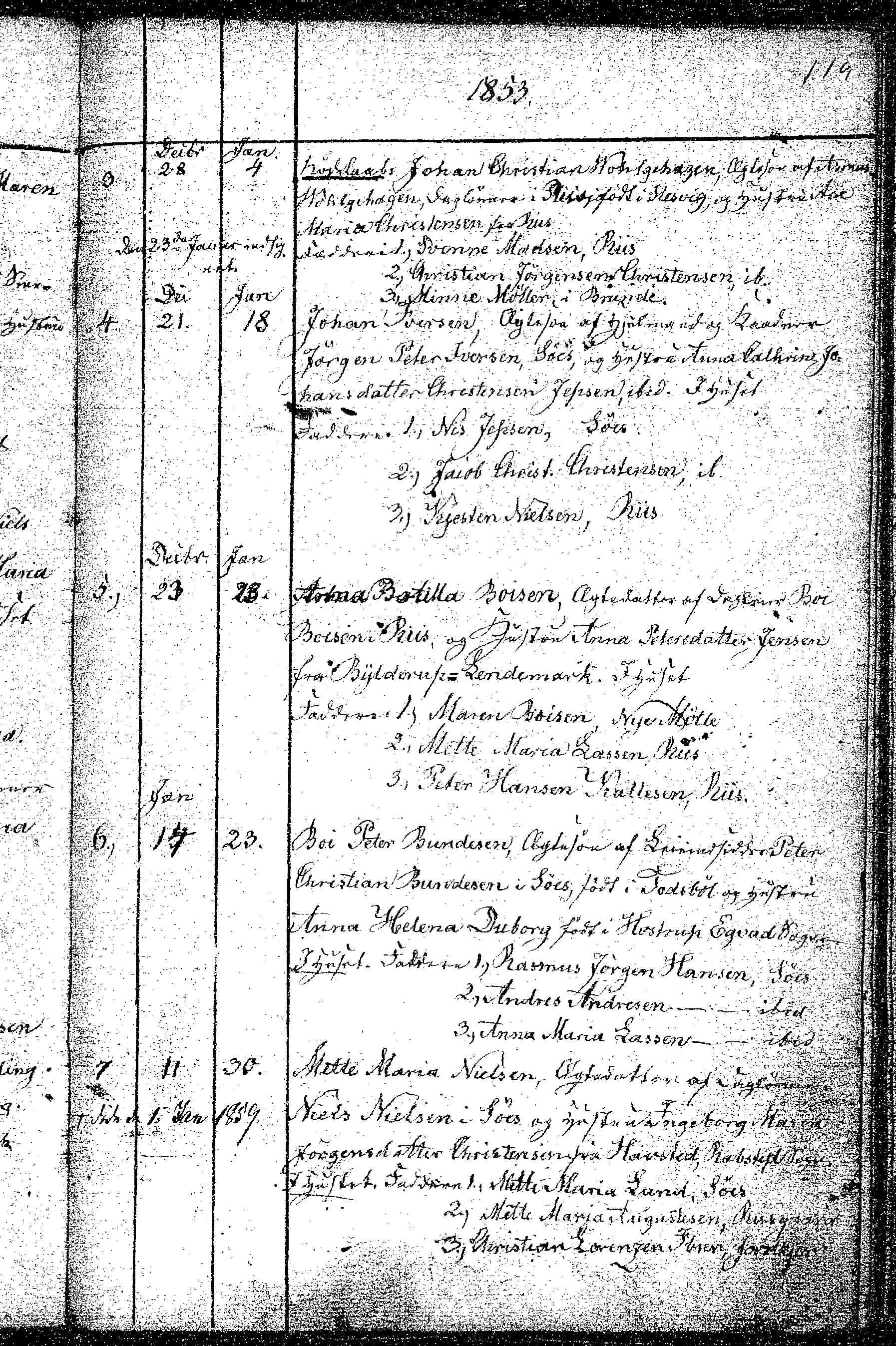 Rise 1825-1857, Opslag 237, Rise Kirkebog 1853, Fødte nr. 6 Født Jan 14, døbt 23 Boi Peter bundesen, ægtesøn af Leieindsidder [tennant] Peter Christian Bundesen i Söes, født i Todsböl og hustru Anna Helena duborg födt i Hostrup Egvad sogn. I huset. Faddere: 1. Rasmus Jørgen Hansen, Söes; 2. Andres Andresen - [Hansen], ibid; 3. Anna Maria Lassen - [Hansen] ibid.