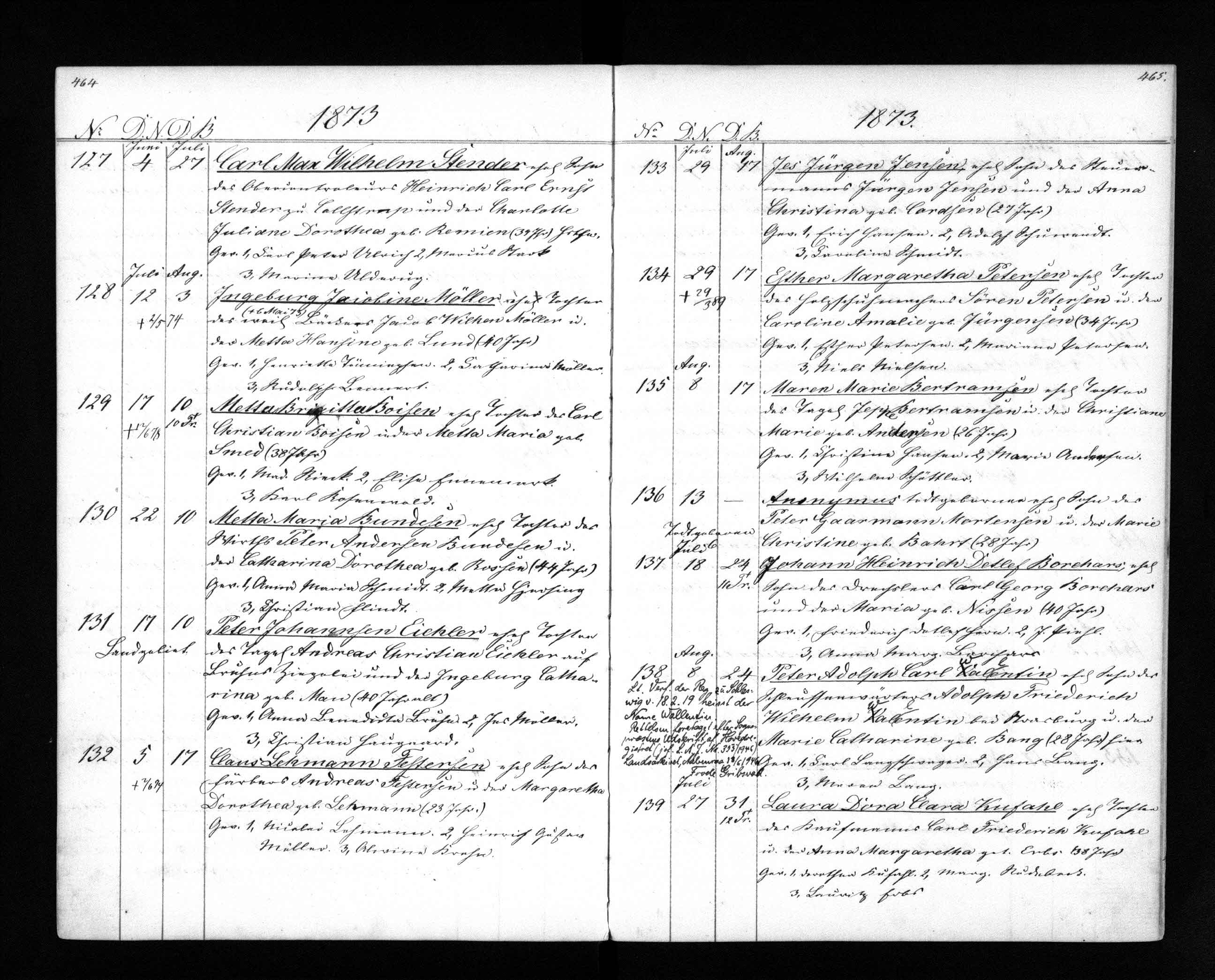 Aabenraa Kirkebog 1873, Fødte nr. 130. Født 22 Juli, døbt 10 Aug Metta Maria Bundesen, ehel. Tochter des Gastwirth Peter Andersen Bundesen u. der Catharina Dorothea geb. Rossen (44 Jahre). Gew.: 1. Anna Maria Schmidt 2. Metta Hjersing 3. Christian Flindt.