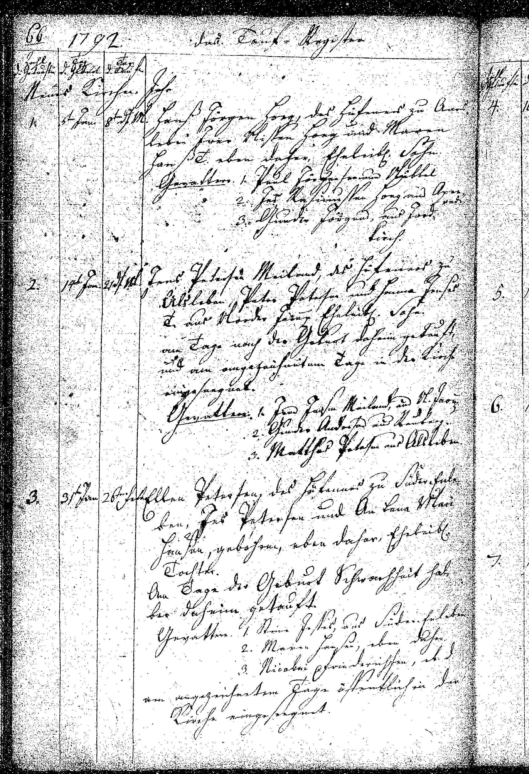 AO, Hjordkær Kirkebog 1770-1840, opslag 67 side 66, nr. 1 Dåb, 08 feb. 1792 Hans Jürgen Hoeg, fra Aarsleben søn af Iver Nissen Hoeg og Maren Hansen ... Faddere: 1 Poul Jørgensen aus Nybøl, 2 Jes Rasmussen Hoeg aus Aarslev 3. ... Jørgensen aus Hjordkær.