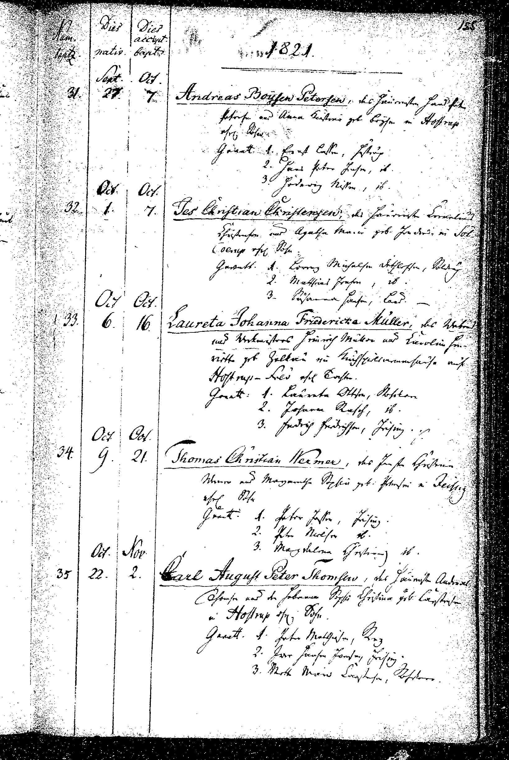 Hoptrup Kirkebog 1821, Fødte nr. 35 Født Oct 22, Døbt Nov. 2 Carl August Peter Thomsen, der ?? Andreas Thomsen und die Johanne Sophie Christine geb. Carstensen in Hostrup ihr Sohn Gew. 1. Peter Mathiesen, R?? 2. Iver Svensen Jensen, Jeising 3. Mette Marie Carstensen, Rohrkarr.