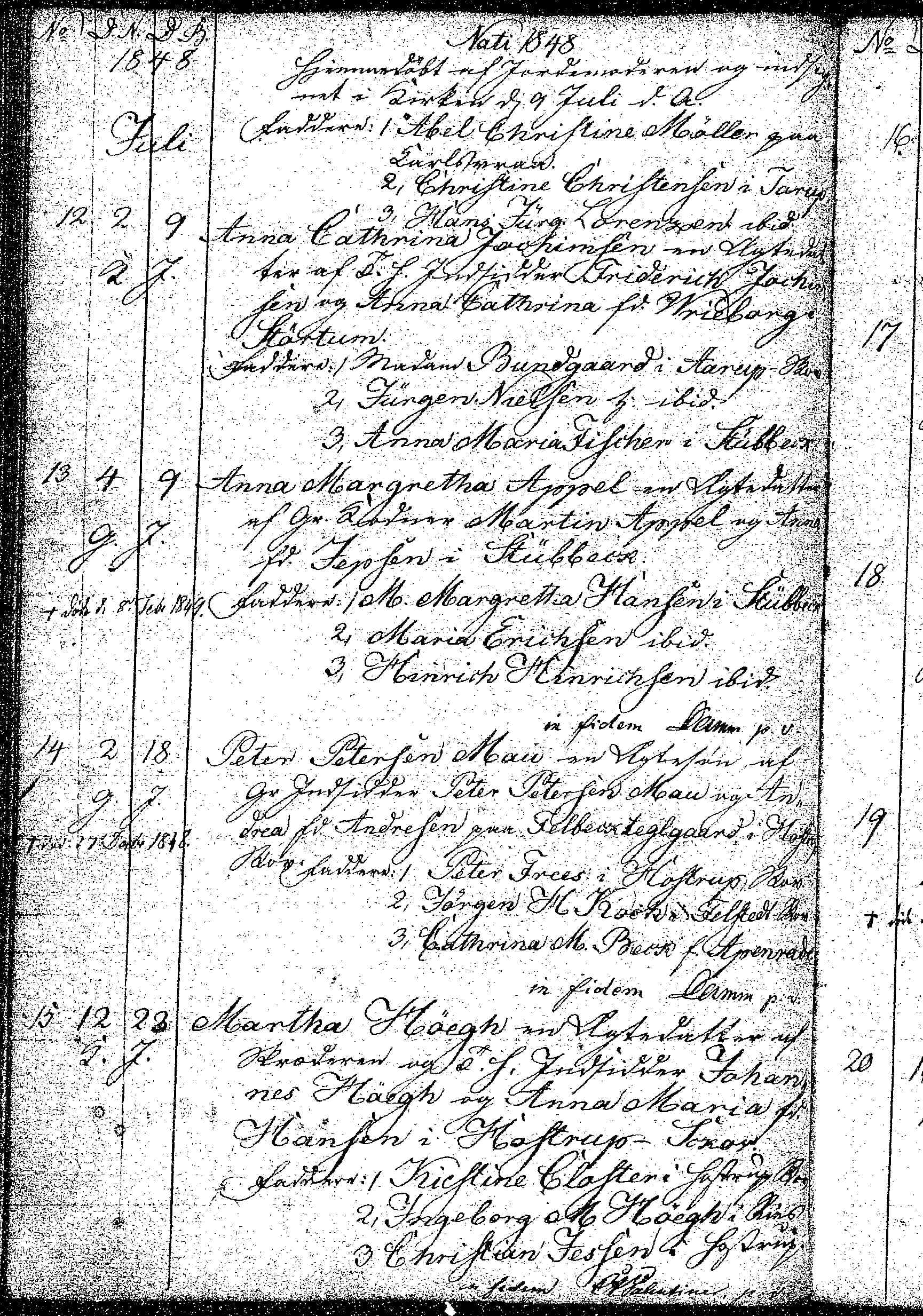AO, Ensted Kirkebog, Lundtoft, Aabenraa, 1767-1850, fødte opslag 386, nr. 15 Dåb, 23 juli 1848 Martha Hoegh, født den 12-07-1848 en ægtedatter af skrædder og insidder Johannes Hoegh og Anna Maria født Hansen i Hostrup skov. Faddere: Kristine Clausen i Hostrup Skov, Ingeborg M Hoegh i ??, Christian Jessen i Hostrup