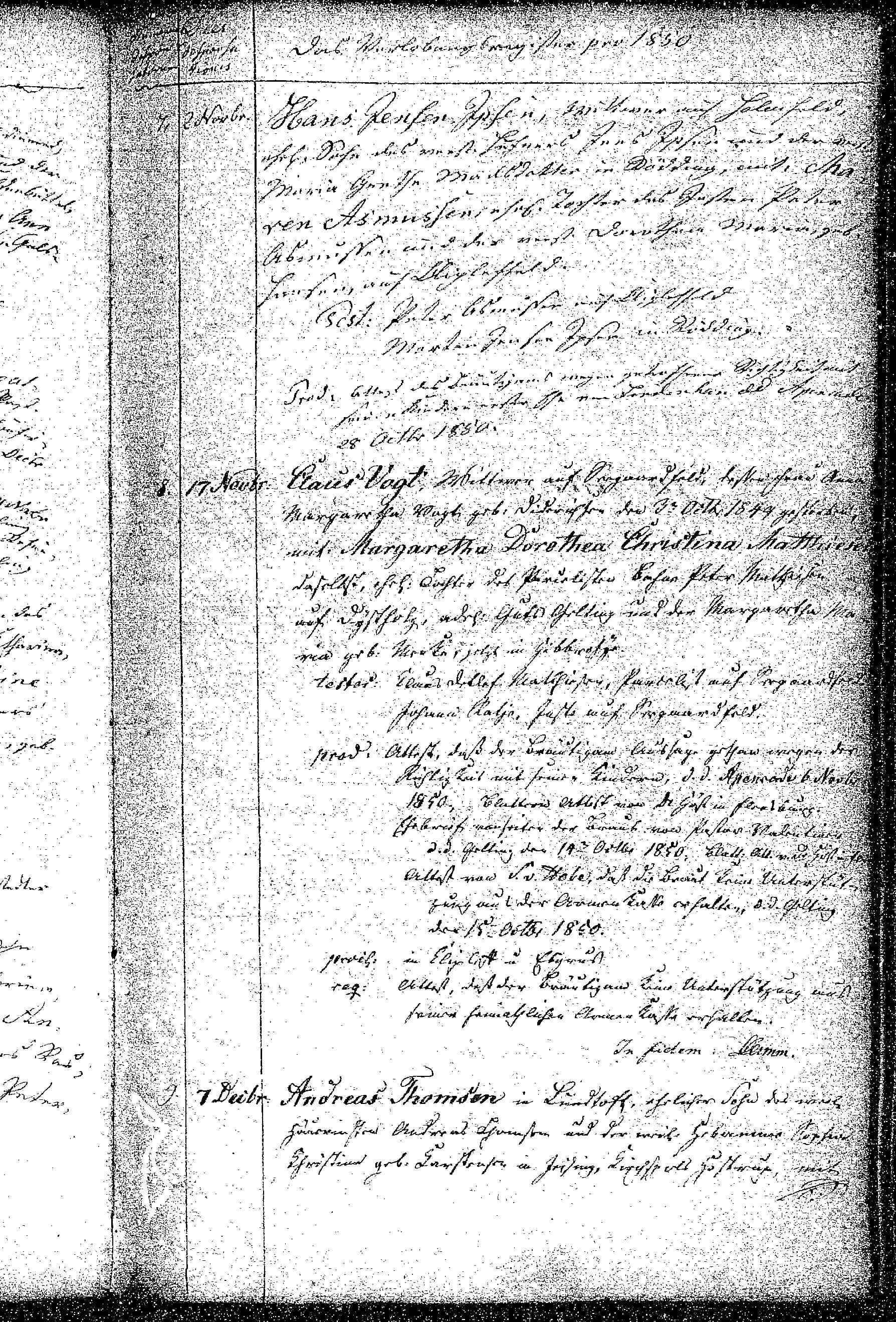 www.arkivalieronline.dk Kliplev 1824-1859, Opslag 490 Kliplev Kirkebog 1850, Trolovede nr. 9 7 Decbr. Andreas Thomsen in Lundtoft, ehelischer Sohn des weil Huusinsten Andreas Thomsen und des weil Hibe?? Sophia Christine geb. Karstensen in Jeising, Kirche alt Hostrup mit Christine Maria Bundesen, ehelische Tocter des Abnahmenes Peter Petersen Bundesen und den verstorbene Botilla Maria geb. Jessen in Lundtoft. Testes: ?? Petra Bundesen in Lundtoft, Nis Peter Petersen in F??bæk Prod. Ægtebevies des Brautigam von Pastor Hoest d.d. Hostrup d. 5 Decbr. 1850 und Wacc. Attest. Weil in Clipleff und Uck.
