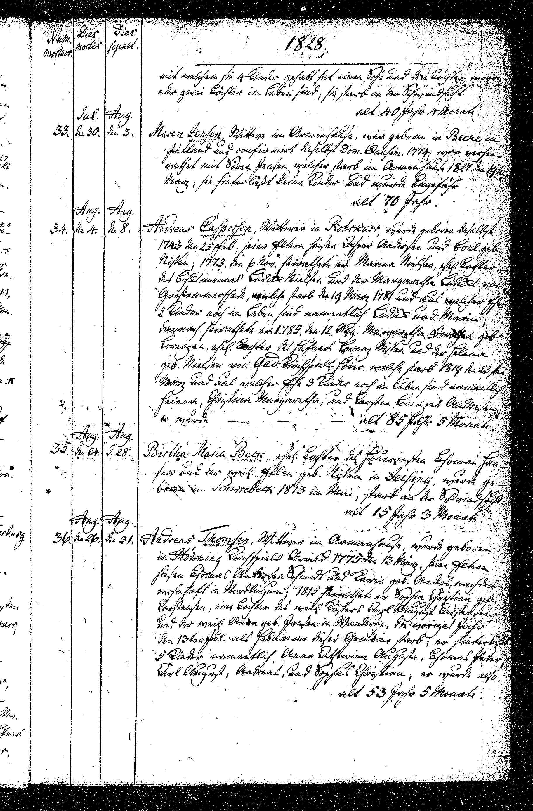 Hostrup Kirkebog 1828, Døde nr. 36 Død Aug. 26, Begr. Aug. 31 Andreas Thomsen, Wittever in Ar?? wurde gebohren in Hönning K?? Arrild 1775 13 März; ?? Thomas ?? Schödt?? und Karen geb. Anders nach dem ?? in Nordlûgum; 1815 verheiratete er Sophia Christine geb. Carstensen, ein Tochter des weil. ?? Carl August Carstensen und der weil. Anne geb. Jensen in skanderup. Er hinterlasst 5 Kinder nafnlich Anna Catrine Magrete, Thomas Peter, Carl August, Andreas und Sophia Christina ER wurde ?? alt 53 Jahre 5 Monate