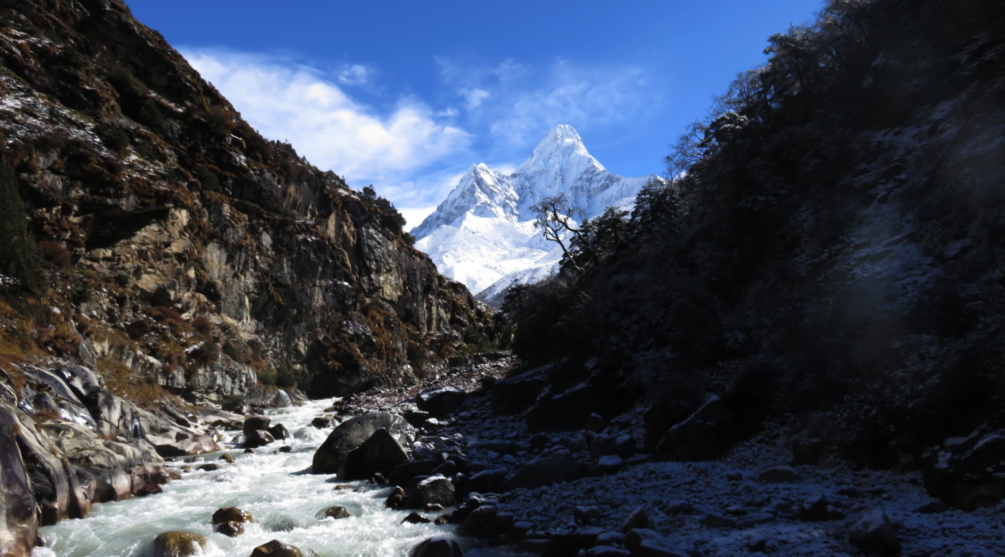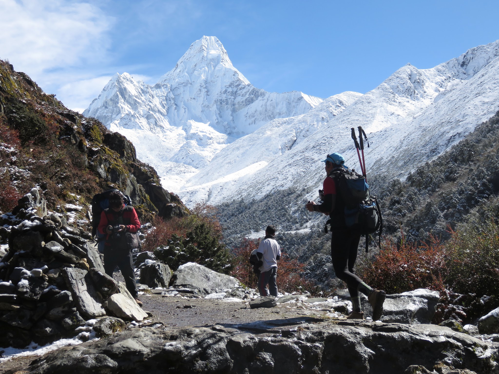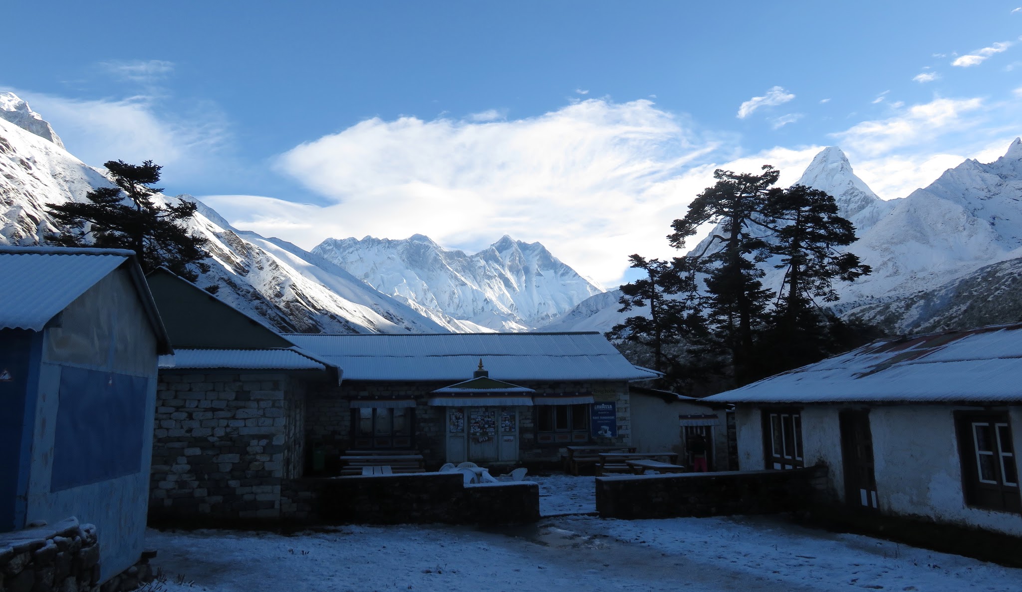 7 dag, hvor vi forsatte videre op i Everestdalen mod Dingboche (4.300 m), skulle vise sig som en af de smukkeste trekking dage under hele rejsen. Også fordi vi var så heldig at snestormen som løbet af natten hærdede i Nepal, som dog sørgeligt dræbte en del Trekkere i området, lagde en fin dyne af sne over landskabet da vi næste morgen vågnede for at trekkere videre. Også i Danmark var vores nærmeste bekrymmede over vores tilstand, heldigvis kunne vi komme i kontakt via internet med vores familie m.m.