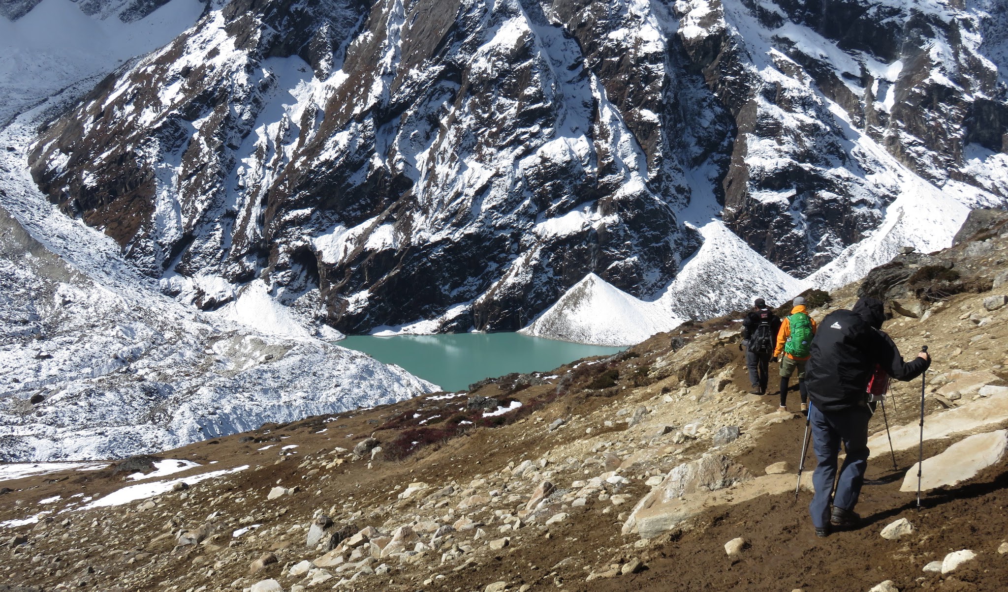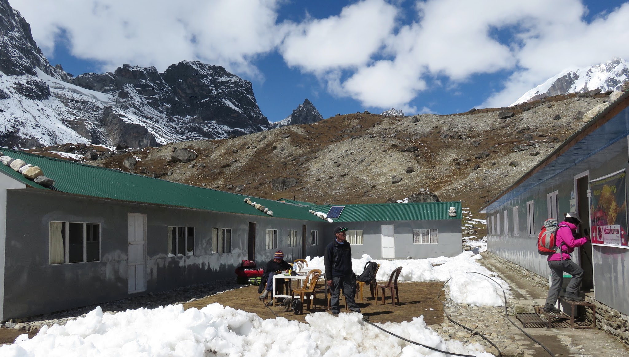 Ovenpå de sidste par dage strabadser, har vi i dag en kort dag (4 timer til Dzongla (4.830 m). Vi startede dagen med at følge Khumbugletsjeren, inden vi drejer ind mod Cho La passet, som vi skal passere i morgen. Ret op af os har vi tvillingetoppene Cholatse og Tawoche, hvis stejle vægge udfordrer dygtige tekniske alpinister fra hele verden hver sæson. For de mest energiske var planen at, krydse op over Awi Peak (5245 m), som er et ikke særligt kendt, og kun lidt besøgt, udkigspunkt. Denne tur blev også afkortet pga af is & for meget sne på toppen. Endestationen Dzongla består blot af to tehuse og bruges kun af folk, der skal krydse Cho La.